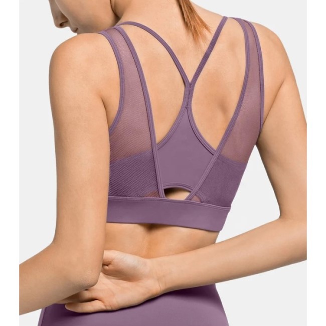 Pull On closure, Midium Support, Pullover Style padded Sports Bra with breathable mesh panel on front and back.